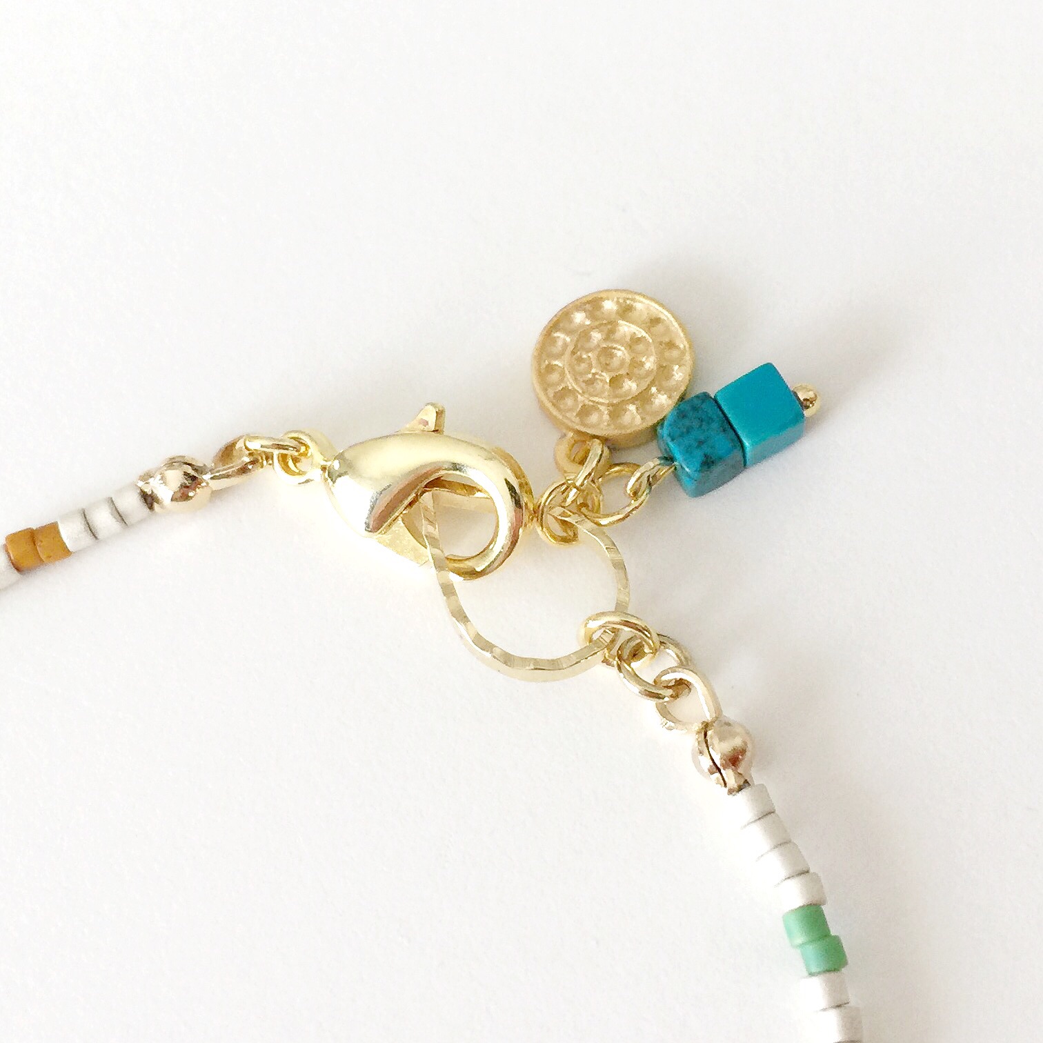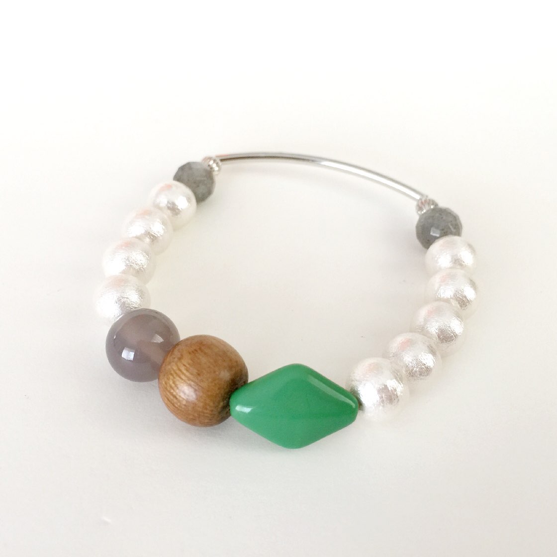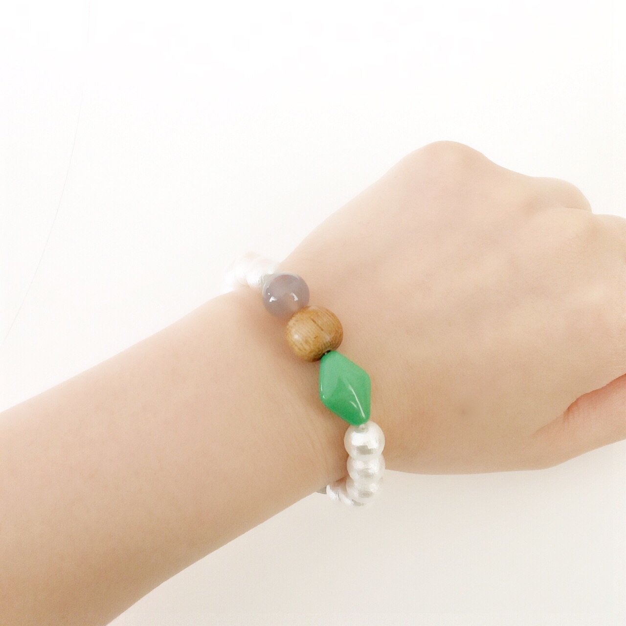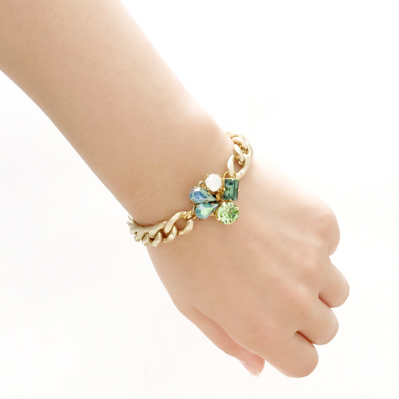 グリーン系でまとめた、ビジューブレスレット。