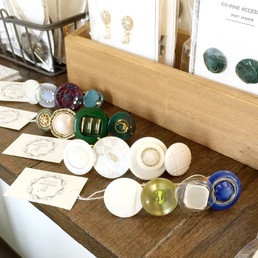 今回は写真のボタンのバレッタのほか、モザイクピアスが中心です。