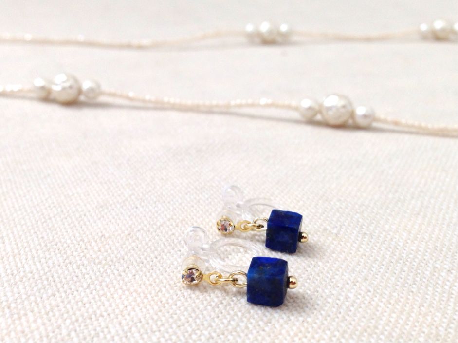 イヤリングは、上質なラピスラズリのスクエアカットを使用しています。