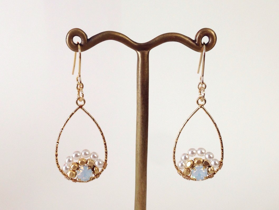 パール&ビジューで飾ったガーリーなフープパーツのピアス、