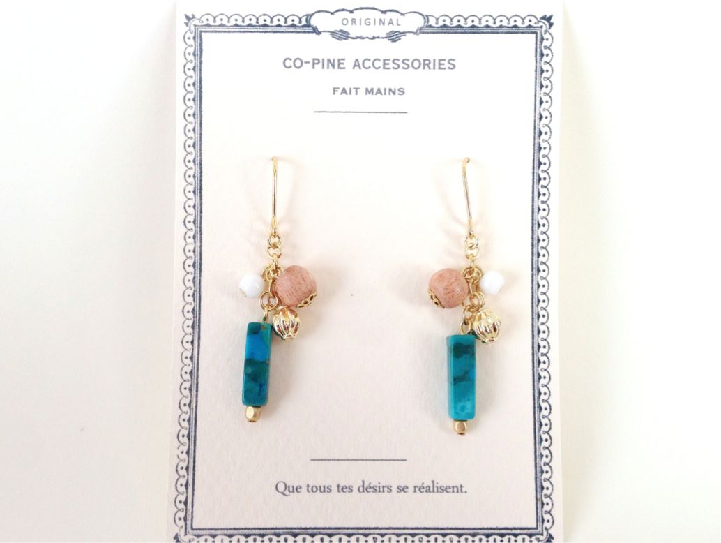 鮮やかなトルコカラーがアクセントの縦長ラインのピアスなど。
