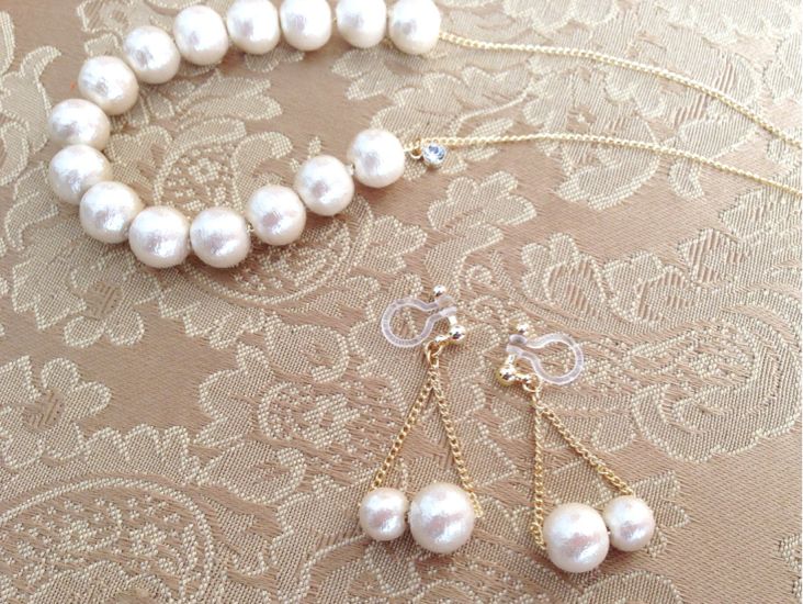サイズ違いのコットンパールを2つ並べ、シンプルで繊細なチェーンで
